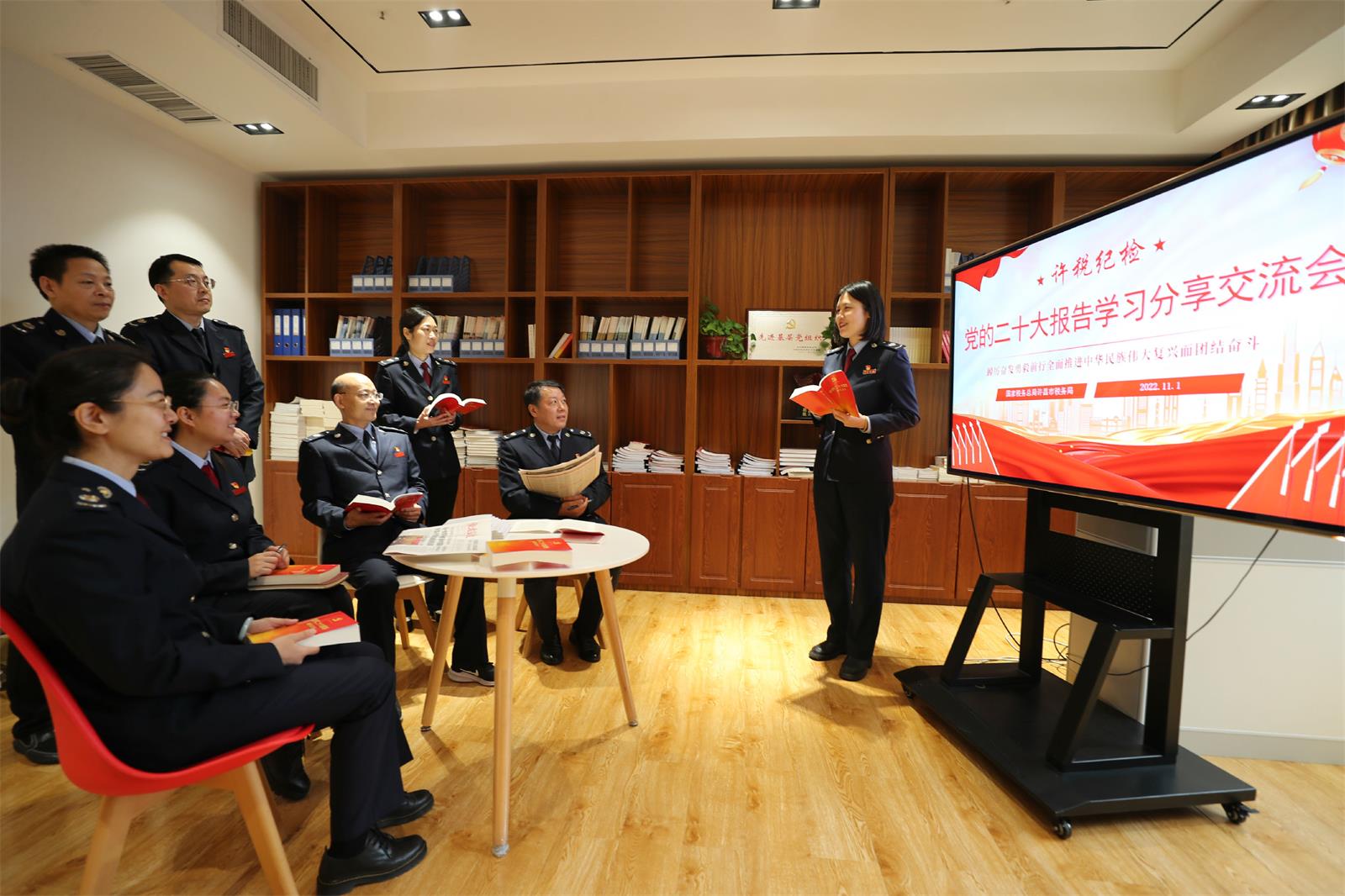 連日來(lái),國(guó)家稅務(wù)總局許昌市稅務(wù)局通過(guò)同步收看現(xiàn)場(chǎng)學(xué)、黨委班子帶頭學(xué)、黨支部集中學(xué)、黨小組分散學(xué)、發(fā)放讀本原文學(xué)等方式,迅速掀起學(xué)習(xí)宣傳貫徹黨的二十大精神熱潮。圖為該局黨委紀(jì)檢組召開“黨的二十大報(bào)告學(xué)習(xí)分享交流會(huì)”。 李建亞 攝