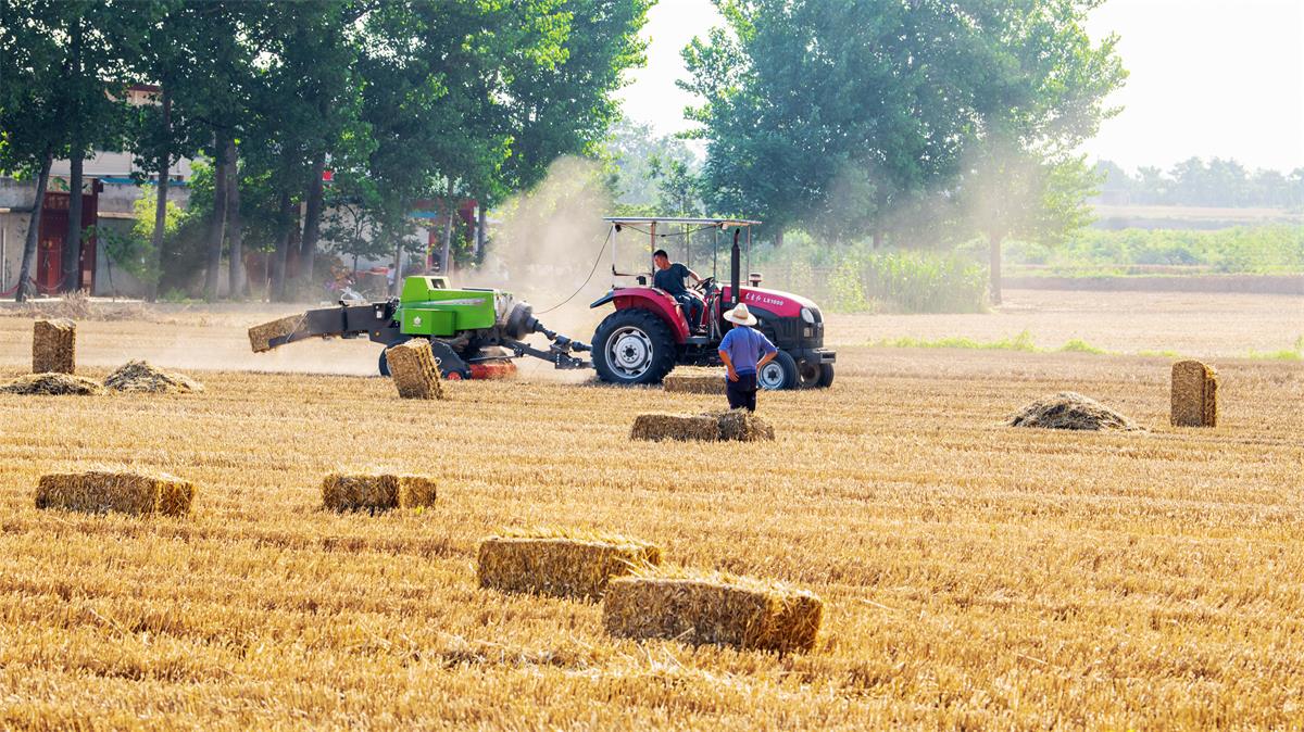 6月11日,襄城縣麥嶺鎮(zhèn)白廟村養(yǎng)牛場(chǎng)員工在麥田里打捆收集麥秸稈。近年來(lái),該縣大力推廣農(nóng)作物秸稈綜合利用,提高秸稈利用價(jià)值,防止焚燒秸稈污染空氣,增加農(nóng)民收入。 簽約攝影師 劉喜芳 攝
