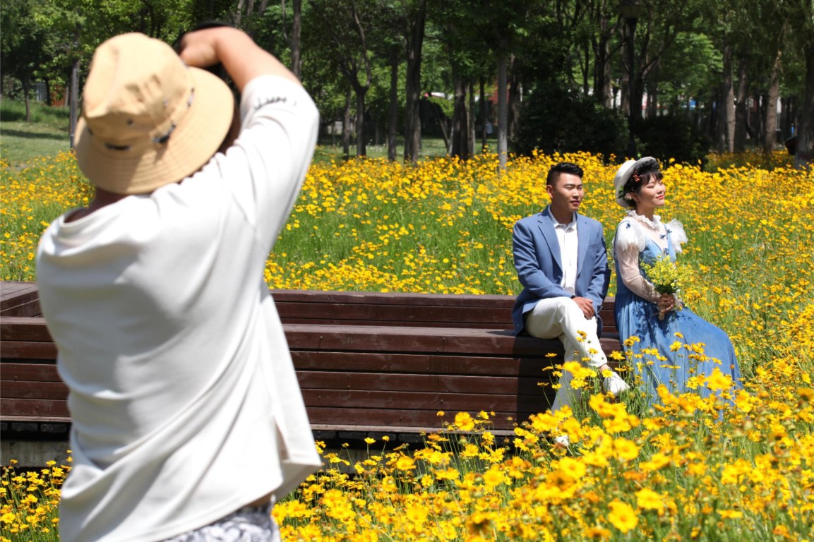 市民在飲馬河畔拍婚紗照。本報記者 牛書培 供圖