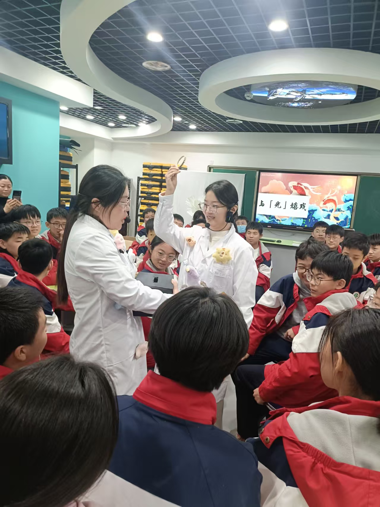 活動(dòng)中,許昌學(xué)院物理學(xué)院教授、博士服務(wù)團(tuán)成員韓紅培在許昌市科技館報(bào)告廳,以《聲學(xué)改變世界》為題,為孩子們帶來(lái)一場(chǎng)生動(dòng)的聲學(xué)講座。韓教授從認(rèn)識(shí)聲學(xué)、走進(jìn)聲學(xué)、前沿聲學(xué)等方面步步深入,帶領(lǐng)學(xué)生走進(jìn)聲學(xué)世界。課堂生動(dòng)鮮活,把高屋建瓴的理論融入實(shí)際生活,得到了同學(xué)們的熱烈呼應(yīng)。隨后,兩位許昌市科技館工作人員為同學(xué)們展示了《與光嬉戲》實(shí)驗(yàn)課。在他們的默契配合下,一個(gè)個(gè)神奇又新穎的光學(xué)實(shí)驗(yàn)依次呈現(xiàn)。在參觀環(huán)節(jié),“傳聲筒”“龍卷風(fēng)”“顛倒屋”“天空艙”等一件件奧秘的展品,激發(fā)了同學(xué)們探索科學(xué)世界的濃厚興趣。