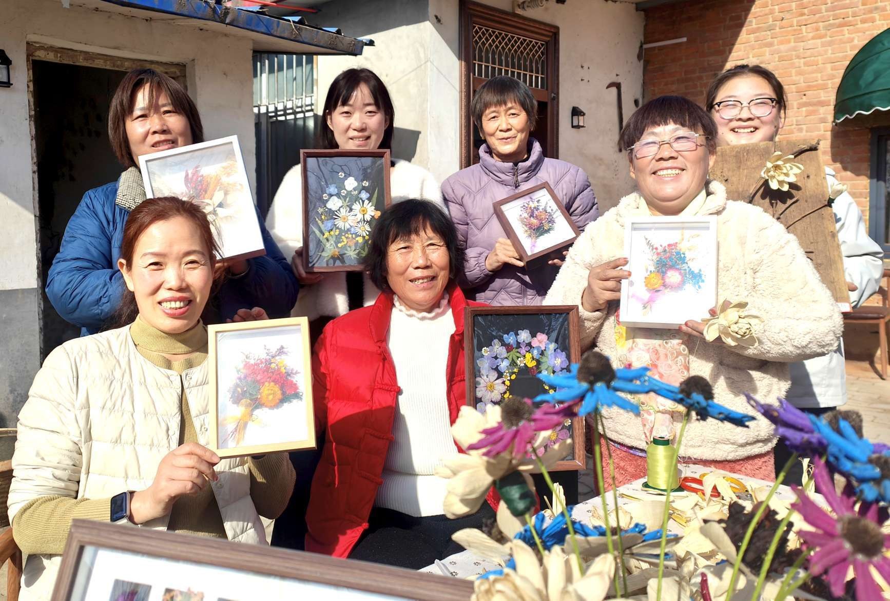 村民在展示自己制作的“干花”。