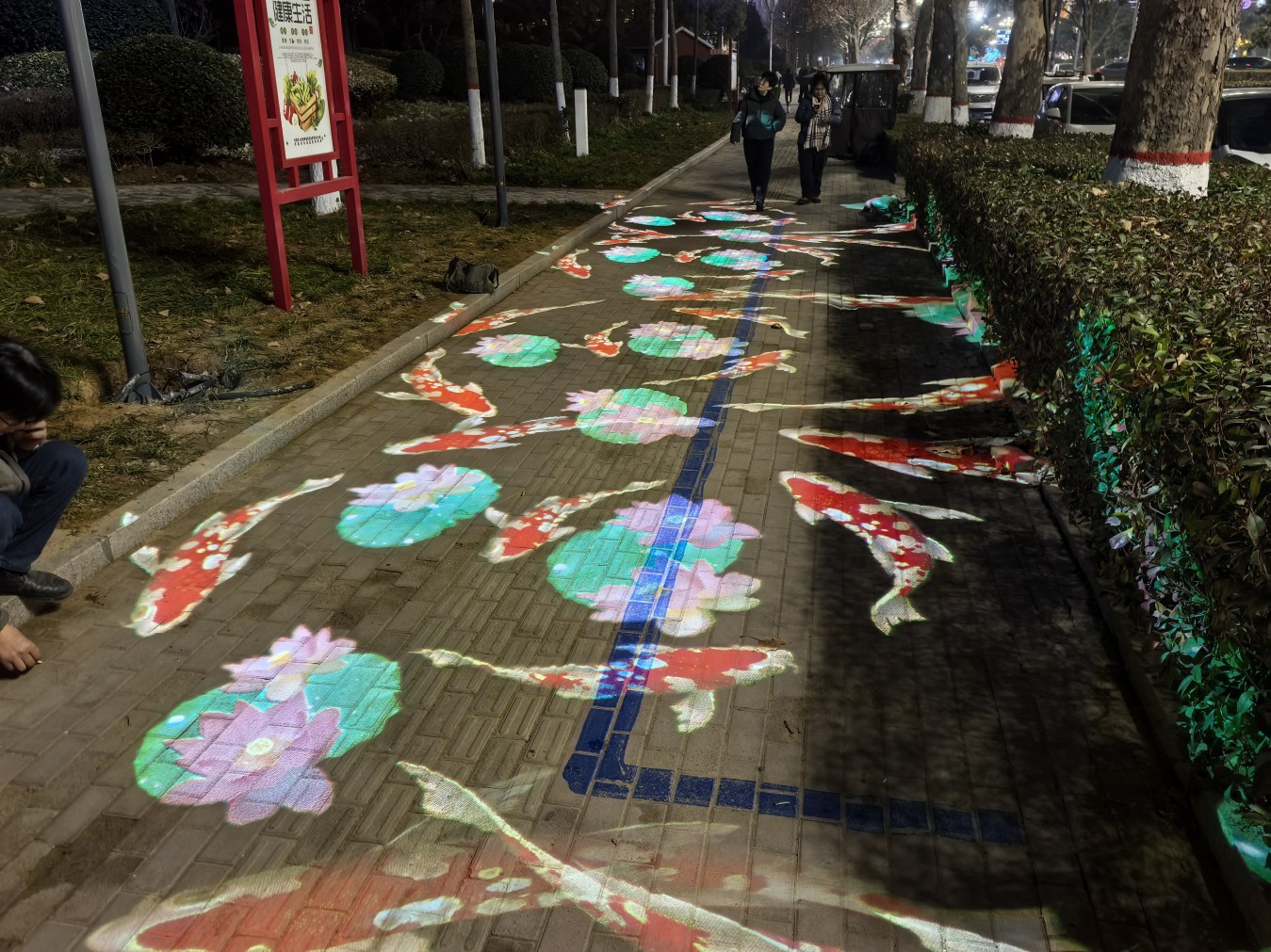 燈光照射下,路面顯現(xiàn)各種圖案。本報(bào)記者 張錚 攝