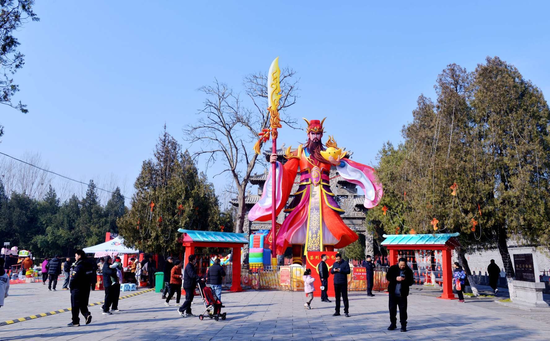 2月21日,灞陵橋景區(qū)。該景區(qū)設置的大型卡通關公像吸引了眾多游客。本報記者 呂科 攝